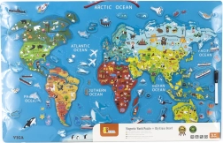 S ovom 2u1 edukativnom pločom djeca ne samo da crtaju, već i otkrivaju svijet putem magnetskih dijelova koji prikazuju kontinente, prometna sredstva i morske životinje. Karta je na engleskom jeziku, što pomaže u učenju engleskog kroz igru. Ploča sadrži 106 dijelova i odlična je pomoć u razvoju raznovrsnih sposobnosti.
