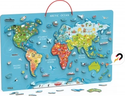 Karta se sastoji od 106 magnetskih dijelova koji prikazuju zemlje, prometna sredstva i životinje, što olakšava učenje geografije.