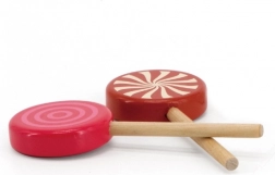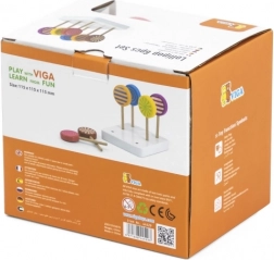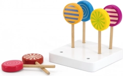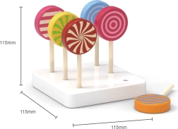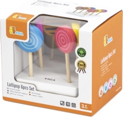 Set sadrži šest drvenih lizalica postavljenih na bijeloj podlozi, koje pridonose poboljšanju motoričkih sposobnosti i vizualnom prepoznavanju.