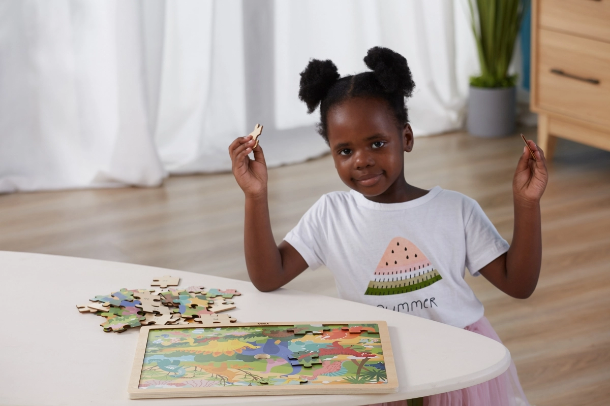 Čvrsta drvena podloga drži dijelove na mjestu, olakšava prenošenje i spremanje te pomaže djeci da se usredotoče na slaganje slike.