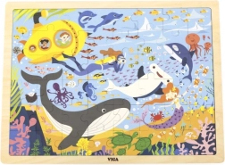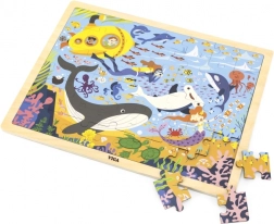 S drvenim puzzlama Morski život otkrit ćete zadivljujuću paletu morskih životinja, poput kitova i ribica, sve zajedno sa žutom podmornicom.