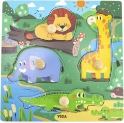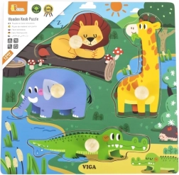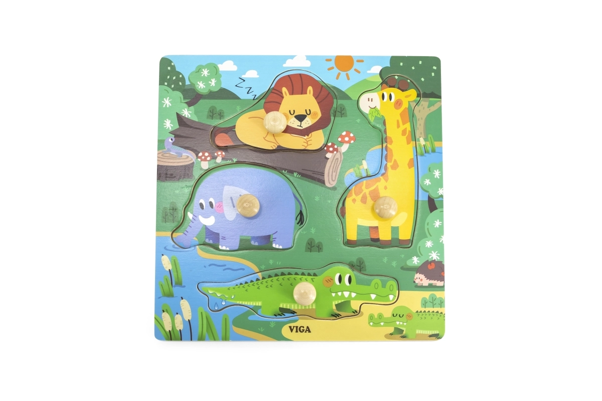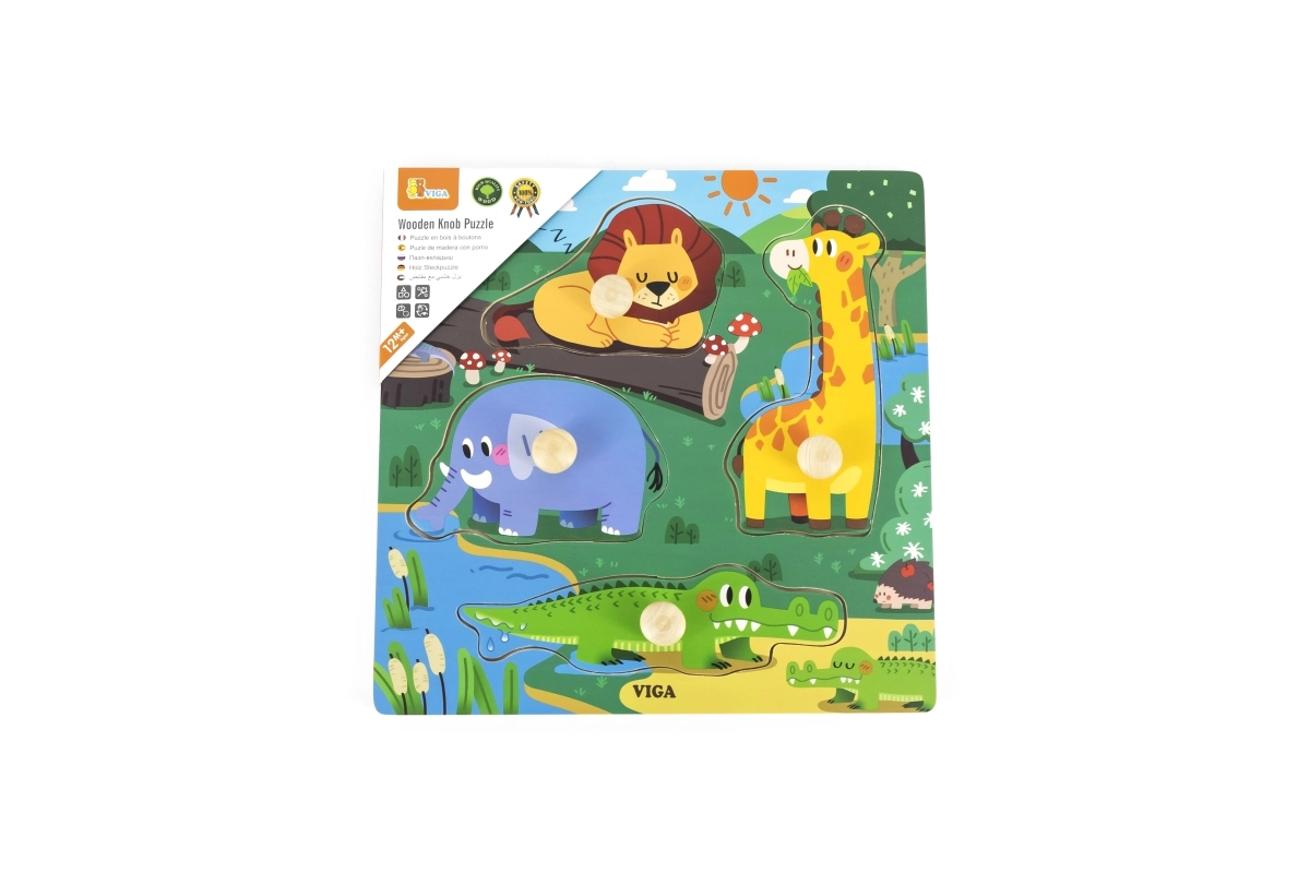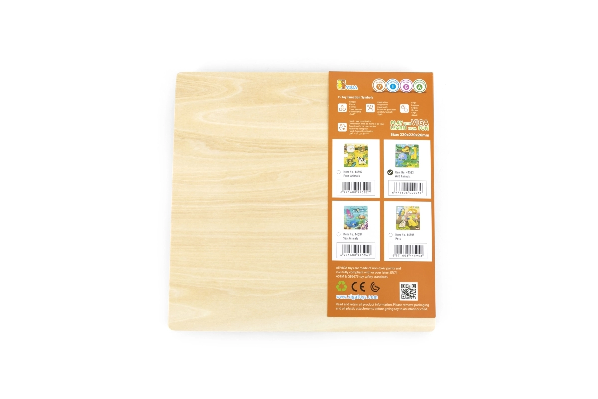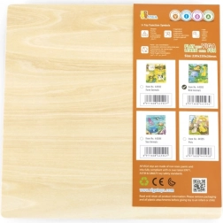 Drvena slagalica s divljim životinjama. Dimenzije drvene ploče cca 22,5 x 22,5 cm. Dimenzije pakiranja cca 22,5 x 25,5 x 1 cm. Dob 12m+