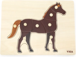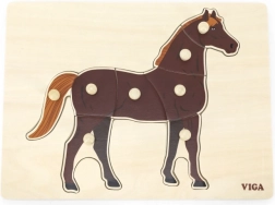 Montessori slagalica s realističnim motivom konja vodi djecu prema samostalnom otkrivanju i usredotočenosti. Pomoću praktičnih ručki lako hvataju pojedine dijelove, uče prepoznavati oblike i uvježbavaju preciznost pokreta. Zahvaljujući kontrastu prirodnog drva i smeđeg konjića obrisi su jasno čitljivi i potiču na igru.