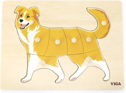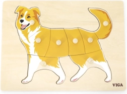 Prva slagalica za djecu od 18 mjeseci: drvena Montessori umetaljka s motivom psa od VIGA. Zahvaljujući ručkicama dijelovi se lako drže, razvijaju finu motoriku, koordinaciju oko–ruka i logičko razmišljanje. Izdržljivo drvo i sigurne boje. Veličina ploče 30 × 22,5 cm.