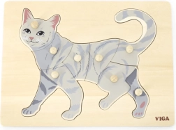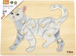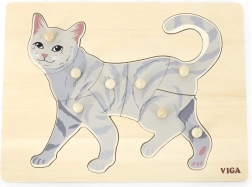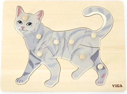 Zadatak djeteta je složiti sliku mačke ne samo prema ilustraciji, već i prema obliku pojedinih dijelića. Gumbićasti držači olakšavaju hvatanje malim prstićima i potiču pravilan pokret ruke. Čvrsta drvena ploča sigurno drži dijelove na mjestu i odolijeva svakodnevnoj upotrebi.