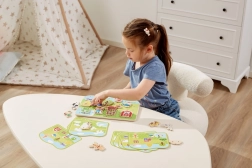 Ovaj set za provlačenje s temom farme idealno je pomagalo za razvoj vještina predškolaca. Djeca prema predlošcima ili vlastitoj mašti provlače vezice kroz šarene drvene dijelove, čime jačaju prste, poboljšavaju hvat te se pripremaju za pisanje i crtanje.