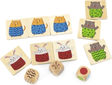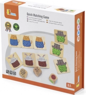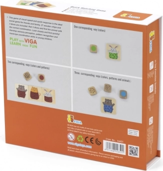 Drvena igra brzo sparivanje brenda VIGA obiteljska je društvena igra koja vježba opažanje, logiku i pamćenje. Igrači bacaju 1–3 kocke i traže točnu životinju s odgovarajućim uzorkom na majici i bojom. Izrađeno od kvalitetnog drva i obojano netoksičnim bojama – sigurno za djecu.