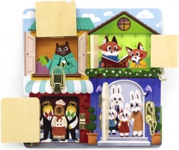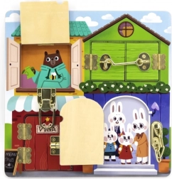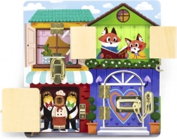 Ova kvalitetna drvena ploča nadahnuta Montessori metodom nudi četvera vratašca sa stvarnim bravama i zasunima koje dijete postupno otključava i zatvara. Svako otvaranje otkriva vesele životinjice, čime potiče znatiželju i koncentraciju.