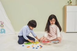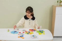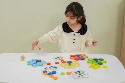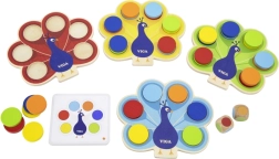 Djeca slažu žetone prema kartama ili bacanju kocke, prirodno usvajaju boje te vježbaju pažnju i logiku.