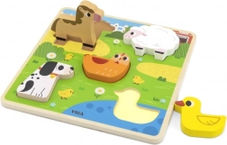 Ova simpatična drvena slagalica s temom farme sadrži 5 robusnih dijelova – konjića, ovčicu, kokicu, psića i pačića. Djeca umeću životinje u odgovarajuće otvore na šarenoj podlozi, čime vježbaju prepoznavanje oblika i vizualno pamćenje.