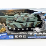 Zabavni tenk za djecu od 3 godine s tamnom kamuflažom nudi zvuk pucnjave, svjetleću cijev i rotirajuću kupolu u svim smjerovima. Kretanje osigurava zamašnjak, napajanje 3× AG13 (baterije su dio pakiranja). Mjerilo 1:32, dimenzije cca 22 × 8 cm.
