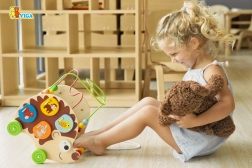 Ova multifunkcionalna vučna igračka u obliku ježa marke VIGA spaja popularne edukativne elemente u jedan pametan centar za igru. Djecu zabavlja pomicanje perlica u kugličnom labirintu, okretanje zupčanicima, prolazak kroz labirint sa životinjama, isprobavanje brojanja i otkrivanje edukativnih rotirajućih elemenata. Šareno izvedena, prirodno poziva na istraživanje i potiče koncentraciju.