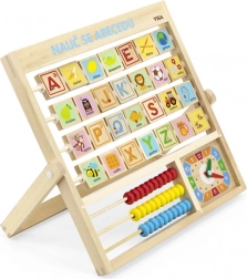 Drvena abeceda i sat na češkom jeziku. Djeca mogu naučiti slova, brojeve i steći opću predodžbu o satu. Svako slovo ima na poleđini riječ radi lakšeg pamćenja. Dimenzije cca 32,5 x 32 x 2,3 cm. Dimenzije pakiranja cca 34 x 32,5 x 3 cm. Dob 3+