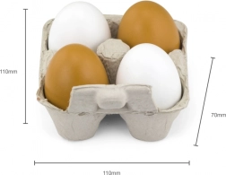 Slatki set drvenih jaja za dječju kuhinjicu sadrži 2 bijela i 2 smeđa jaja u realistično kartonskom pladnju. Jaja veličine cca 6 × 5 cm potiču igre uloga, finu motoriku i učenje boja. Idealno za djecu od 24 mjeseca.