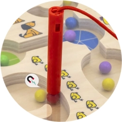 Sadrži magnetsku olovku za lako premještanje kuglica po stazama, što pomaže razvoju fine motorike.