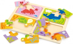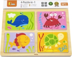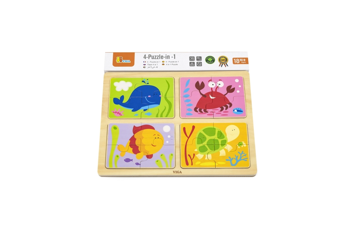 Otkrijte radost slaganja s ovim drvenim puzzlama 4u1 s motivima morskih životinja. Četiri zasebne slagalice (kit, rak, riba i kornjača) potiču finu motoriku, logičko razmišljanje i prepoznavanje oblika i boja. Idealno za djecu od 18 mjeseci.