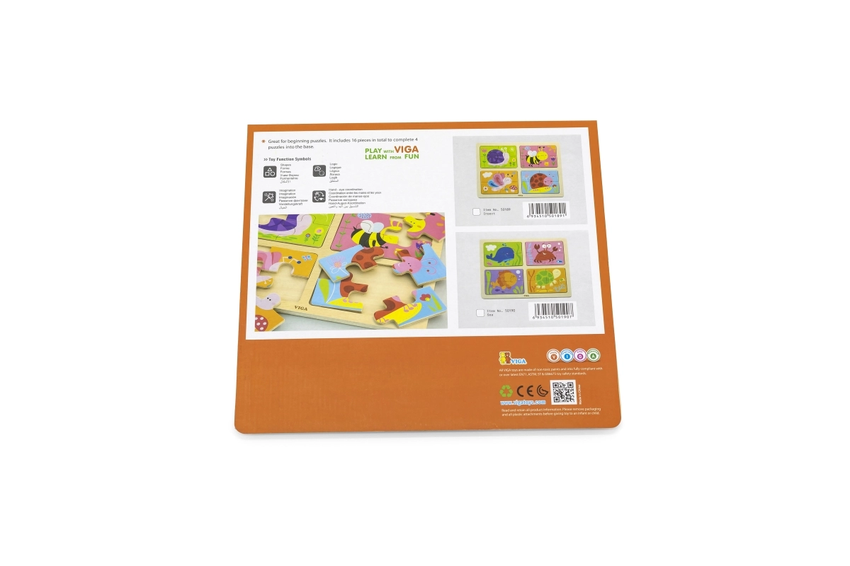 Svaka slagalica ima svoju podlogu, što olakšava snalaženje i pomaže djeci brže postići uspjeh. Čvrsti drveni dijelovi ugodni su na dodir, dobro leže u ruci i izdržat će često korištenje.