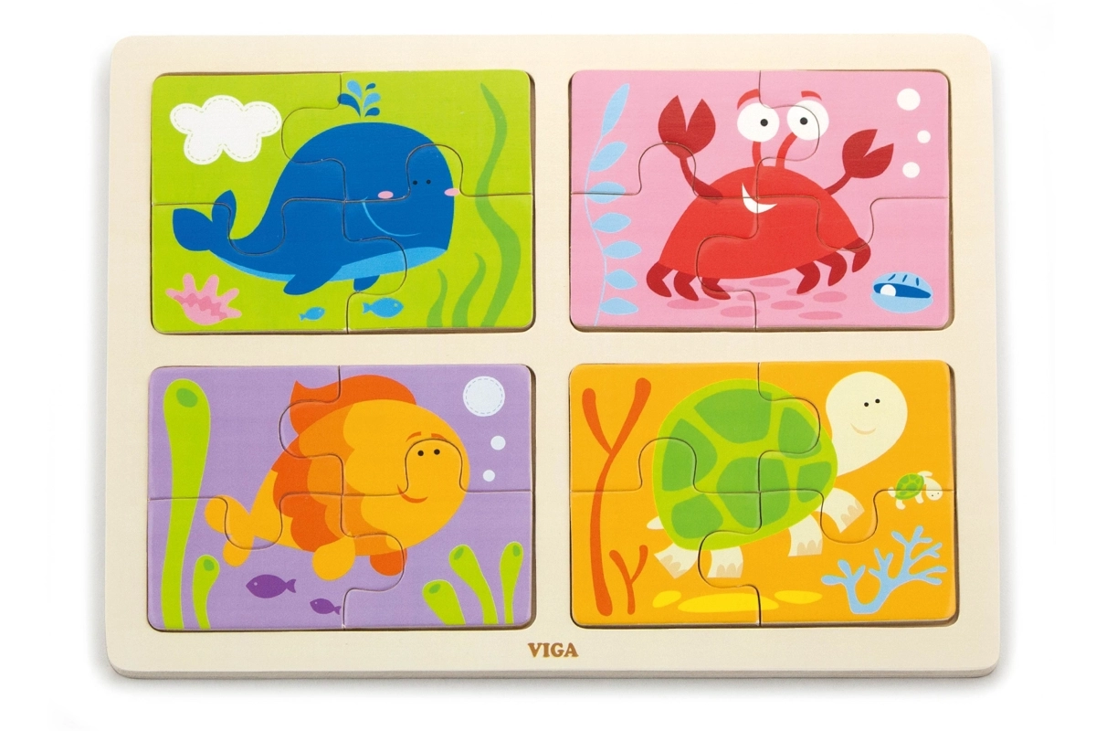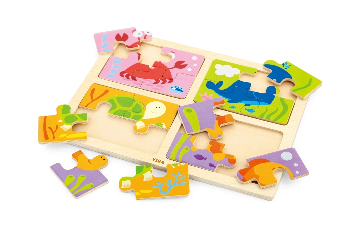 Ovaj set sadrži četiri jednostavne drvene puzzle s preslatkim motivima morskih životinja. Zahvaljujući manjem broju dijelova idealne su za prvo upoznavanje djece sa slaganjem, razvijaju koordinaciju oko–ruka i uče strpljenju.