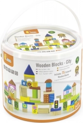 Ovaj drveni set za izgradnju nudi 75 raznobojnih kockica za stvaranje gradskih scenarija. Paket uključuje ilustriranu brošuru s uputama koja inspirira djecu na kreativno građenje. Sve je upakirano u praktičnu kantu s ručkom dimenzija cca 22,5 x 20 cm.