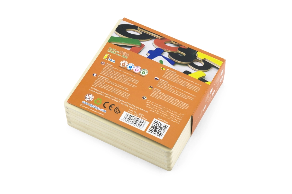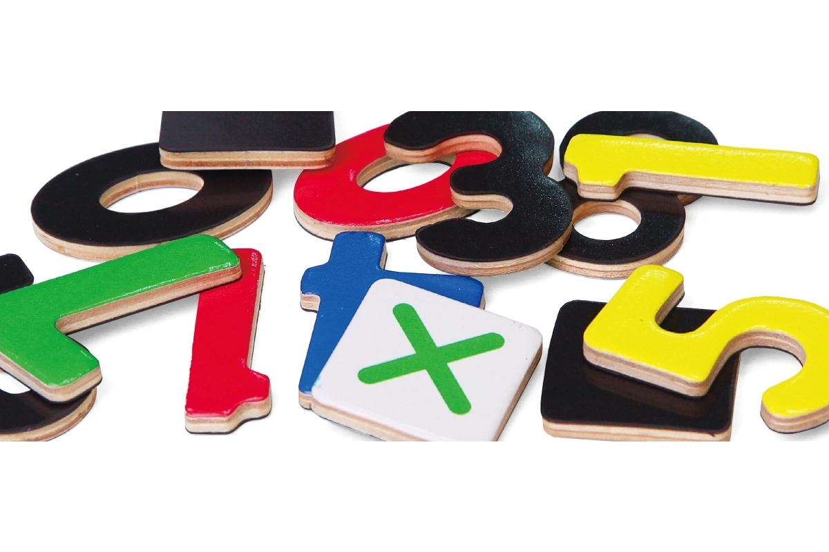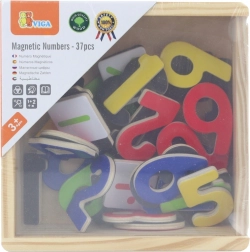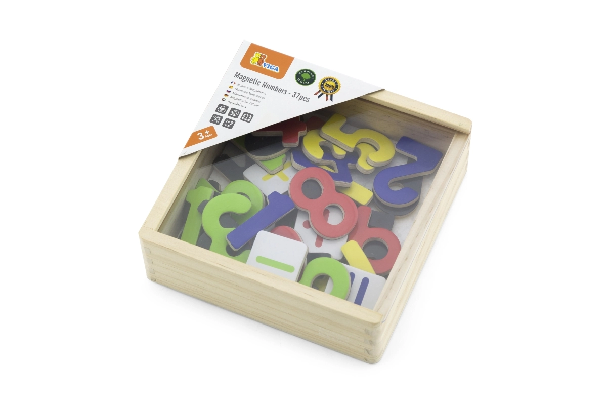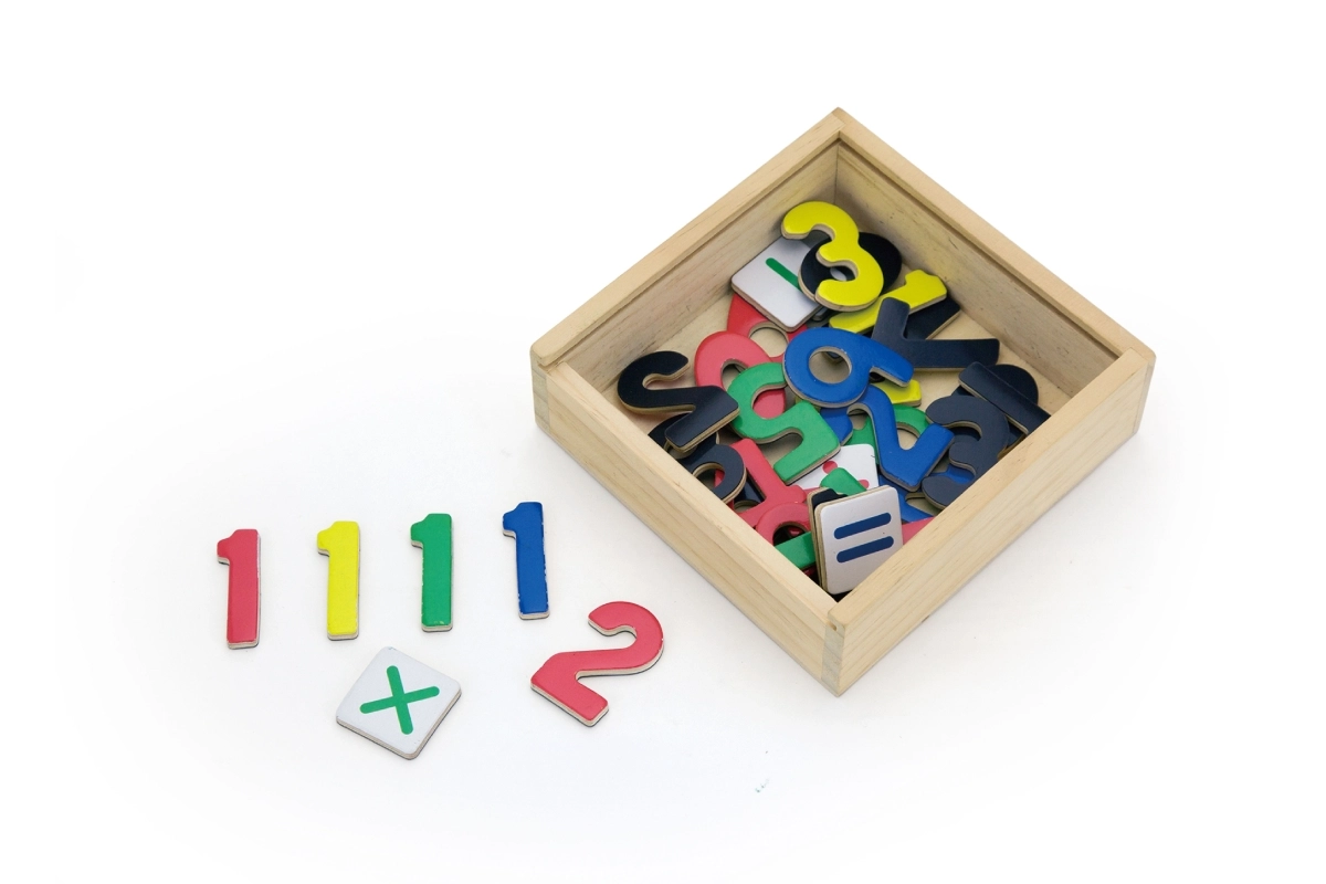Sadrži 37 komada – znamenke i matematičke simbole – koji se zahvaljujući magnetskom sloju pouzdano pričvršćuju na ploču ili hladnjak. Robusna, višeslojna drvena konstrukcija i glatke lakirane površine osiguravaju dug vijek trajanja i udobno držanje za male ruke.