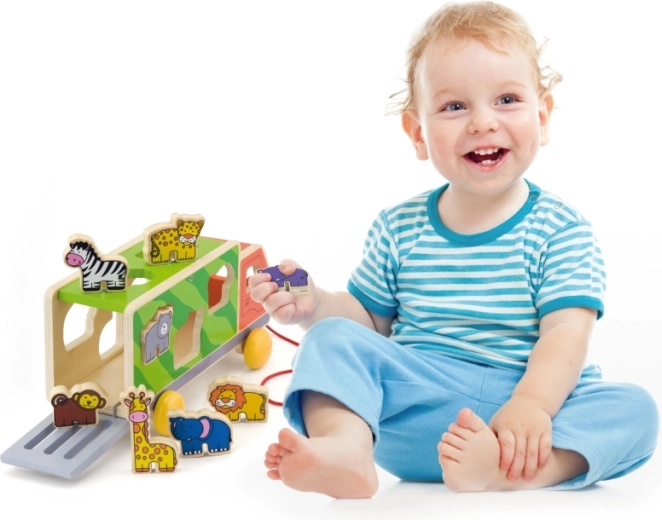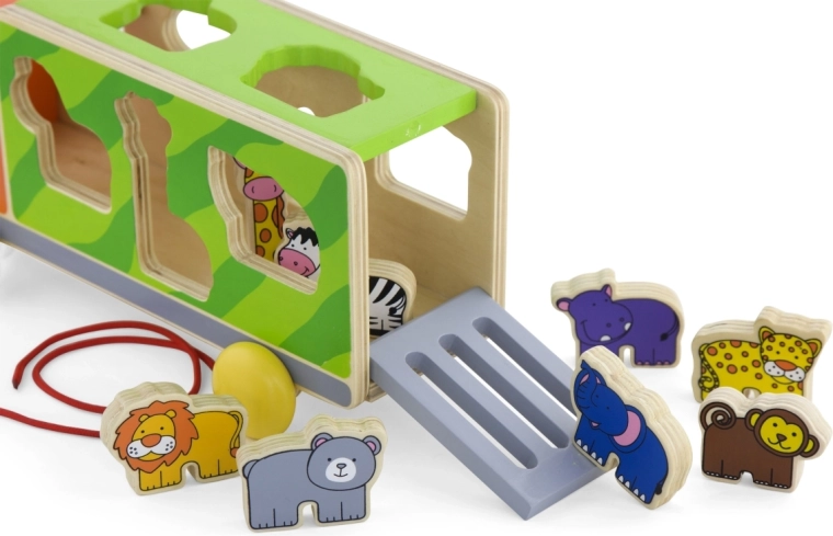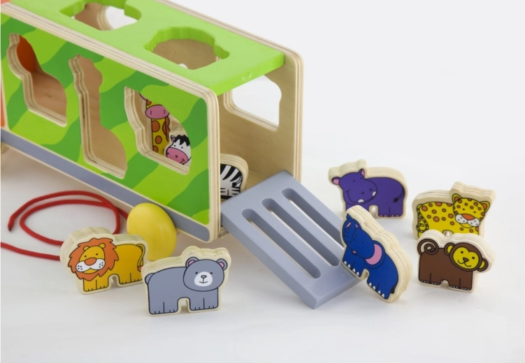 Ovaj šareni drveni kamion spaja povlačilicu i umetaljku 2u1. Djeca vuku kamion na uzici i istovremeno umeću životinje u odgovarajuće otvore, čime treniraju strpljenje, logiku i spretnost prstića. Glatko obrađeni rubovi i izdržljiva izrada stvoreni su za svakodnevnu igru.