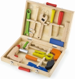 Praktični drveni set alata u čvrstom kovčežiću za male majstore od 3 godine. Sadrži 12 dijelova (bušilica, čekić, pila, ključ, odvijač itd.) koji potiču finu motoriku, kreativnost i igru malog majstora. Kompaktne dimenzije cca 31,5 × 24 × 6 cm, metalne kopče i crvena ručka za lako prenošenje.