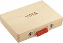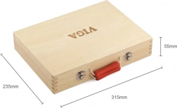Čvrst drveni kovčežić s metalnim kopčama i crvenom ručkom drži sve na svom mjestu, pa se nijedan dio neće izgubiti. Zahvaljujući preglednoj organizaciji svaki alat ima svoje mjesto, a cijeli je set lako prenosiv za posjete, putovanja i dječju sobu.