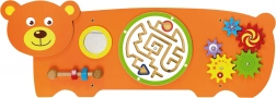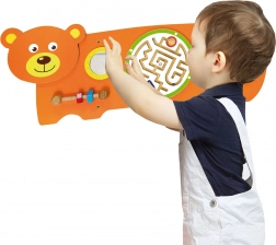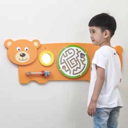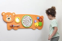 Osjetilna ploča Medvjedić dizajnirana je prema Montessori principima kako bi djecu prirodno motivirala na istraživanje i uvježbavanje vještina. Nudi više vrsta aktivnosti: okretanje zupčanika, vođenje kuglice u labirintu, promatranje u sigurnom zrcalcu i trening hvata pomoću vijaka s navojem. Zahvaljujući robusnoj drvenoj konstrukciji i mogućnosti zidne ugradnje izvrsno se uklapa u dječje sobe, igraonice i vrtiće.