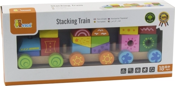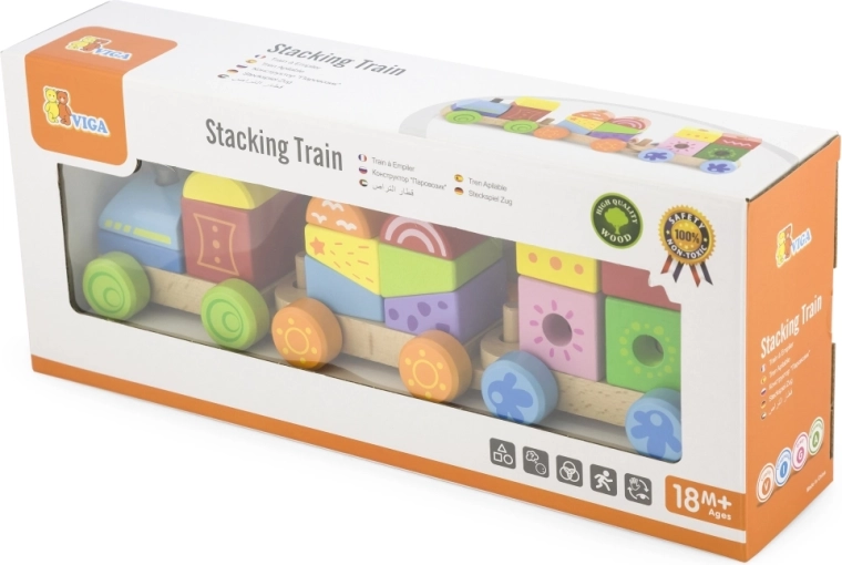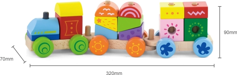Ovaj drveni slagajući vlakić idealan je prvi set za djecu od 18 mjeseci. Šarene kocke i oblici stavljaju se na kolčiće pojedinih vagončića, čime potiču prirodno učenje, strpljenje i maštu. Duljina vlakića oko 31,5 cm osigurava laku manipulaciju i za male ruke.