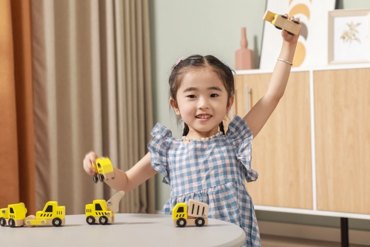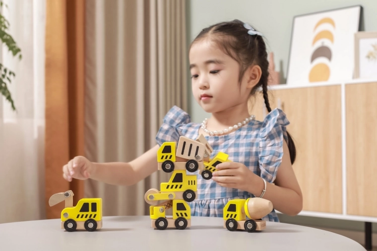 Svako vozilo ima funkcionalne kotače za glatko kotrljanje, a neki dijelovi sugeriraju pomične elemente (npr. žlica, mješalica ili dizalica), što potiče prirodnu znatiželju i razvoj koordinacije oko–ruka.