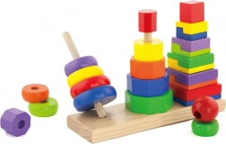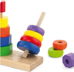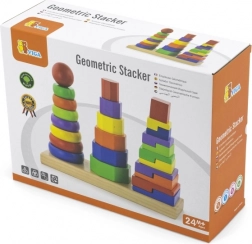 Drvena slagalica piramida idealna je igračka za djecu od 2 godine, koja podržava razvoj motorike i prepoznavanje oblika kroz šarene geometrijske dijelove.