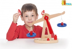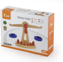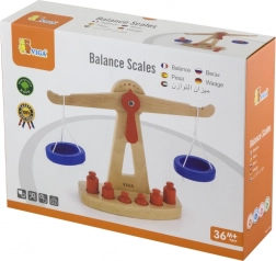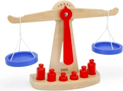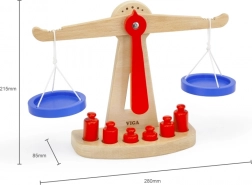 Drvena balansirajuća vaga marke Viga opremljena je s dvije plave zdjelice obješene na konopcima i uključuje šest crvenih utega različitih veličina. Zahvaljujući šarenom dizajnu i sigurnoj površinskoj obradi, ova vaga donosi djeci puno zabave. Vaga je dizajnirana kako bi potaknula djecu na korištenje njihove mašte i kreativnosti u igri trgovanja, što im pomaže razumjeti osnovne matematičke koncepte i vrijednost ravnoteže.