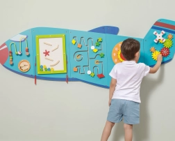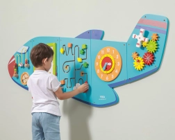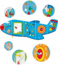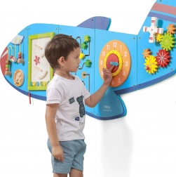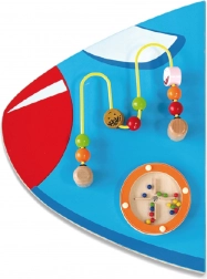 Drvena zidna ploča Avion brenda VIGA je višenamjenska igračka koja se sastoji od pet dijelova koji zajedno čine oblik aviona. Svaki element nudi drugačiju vrstu aktivnosti za zabavan razvoj dječjih vještina:
