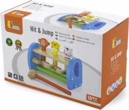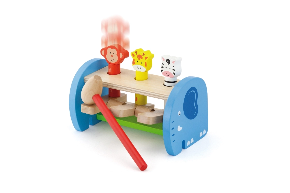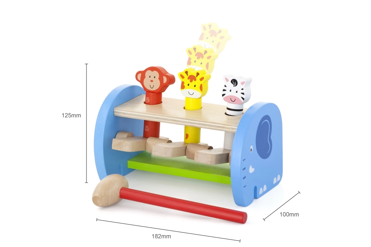 Ova kvalitetna drvena igračka nudi sigurnu i šarenu igru s preslatkim životinjicama. Djeca pomoću čekića lupkaju po mehanizmu koji životinjice tjera da iskoče – tako usavršavaju hvat, snagu stiska i preciznost pokreta. Čvrsta konstrukcija i glatki rubovi osiguravaju sigurnost pri svakodnevnom korištenju.