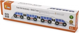 Drveni brzi vlak unosi dinamiku i moderan stil u svaku drvenu željezničku prugu. Vlak je izrađen od izdržljivog drva i ima glatke rubove za sigurno svakodnevno igranje. Zahvaljujući kompaktnoj duljini od oko 29 cm odlično leži u dječjoj ruci i nudi zabavu i učenje u jednom.
