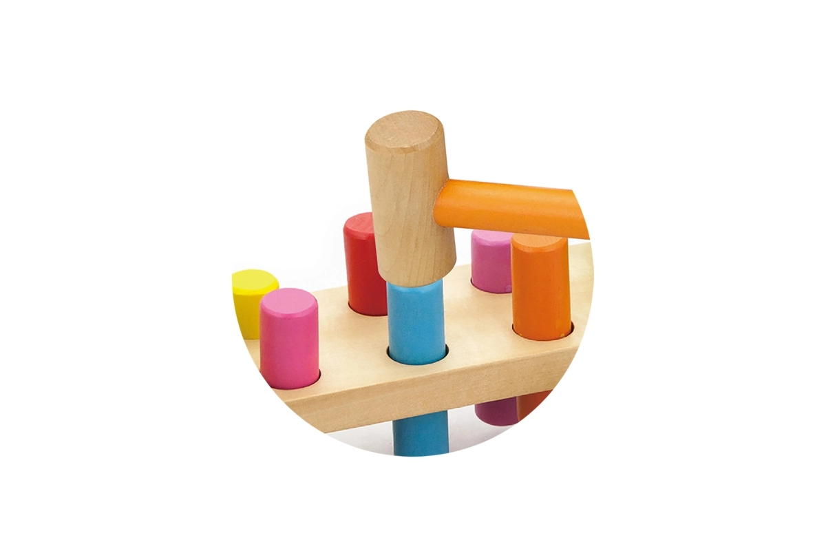 Ova drvena čekić igračka dimenzija cca 22,5 × 12 × 7,7 cm donosi djeci sate smislenog uživanja u igri. Šareni se kolčići zabijaju drvenim čekićem, čime djeca prirodno razvijaju snagu hvata, preciznost pokreta i logičko razmišljanje. Izdržljiva konstrukcija i glatke površine osiguravaju sigurnu uporabu.