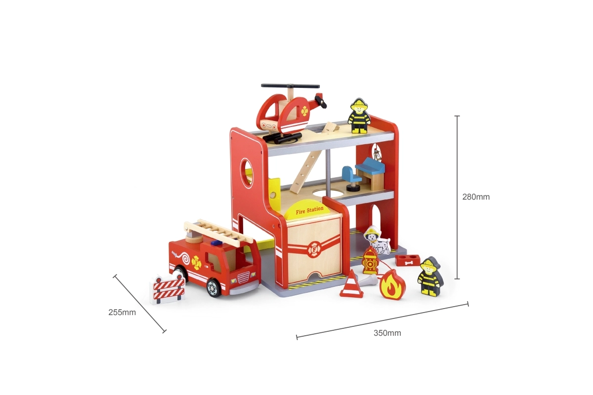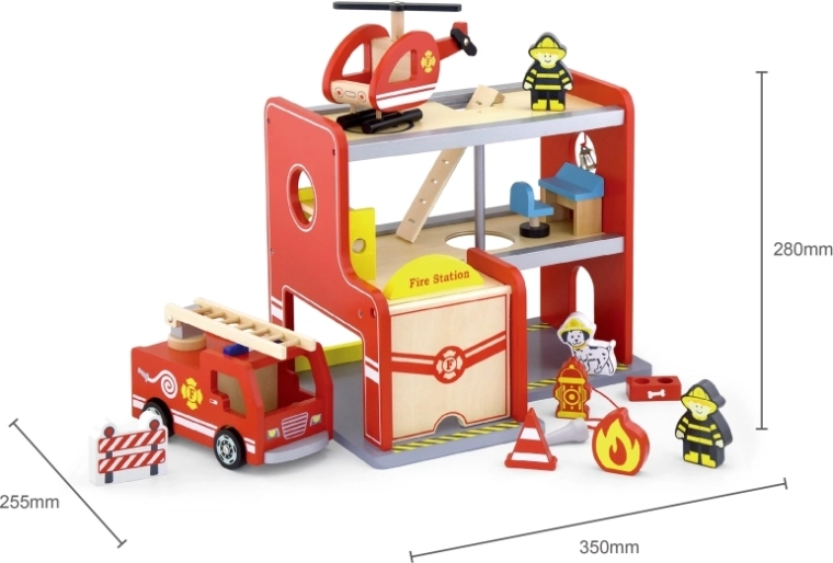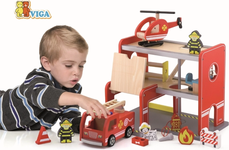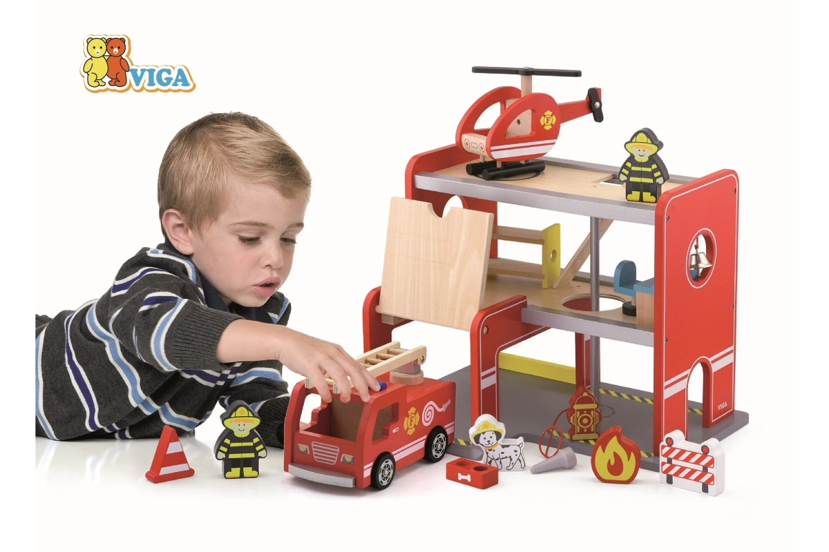 Drvena vatrogasna postaja Viga kompletan je igraći set s više katova koji potiče igru uloga, razvoj fine motorike i mašte. Djeca mogu izlaziti iz garaže vozilom, slijetati helikopterom na gornju platformu i spustiti se cijevi izravno na intervenciju. Šareni detalji i kvalitetna drvena konstrukcija osiguravaju privlačan izgled i otpornost pri svakodnevnoj upotrebi.