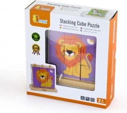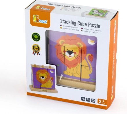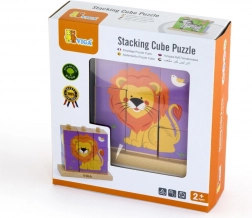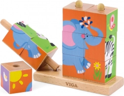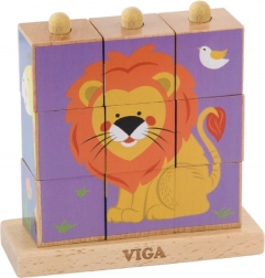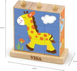 Drvene slagalice s kockama Viga Safari bezvremenska su igračka koja djecu prirodno vodi učenju kroz igru. Devet glatko obrađenih kocki na stabilnoj bazi omogućuje slaganje četiri živopisna motiva životinja. Zahvaljujući nagibnim klinićima kocke se lako okreću i djeca brže pronalaze pravi dio.