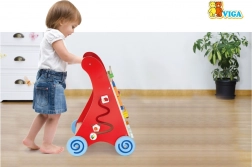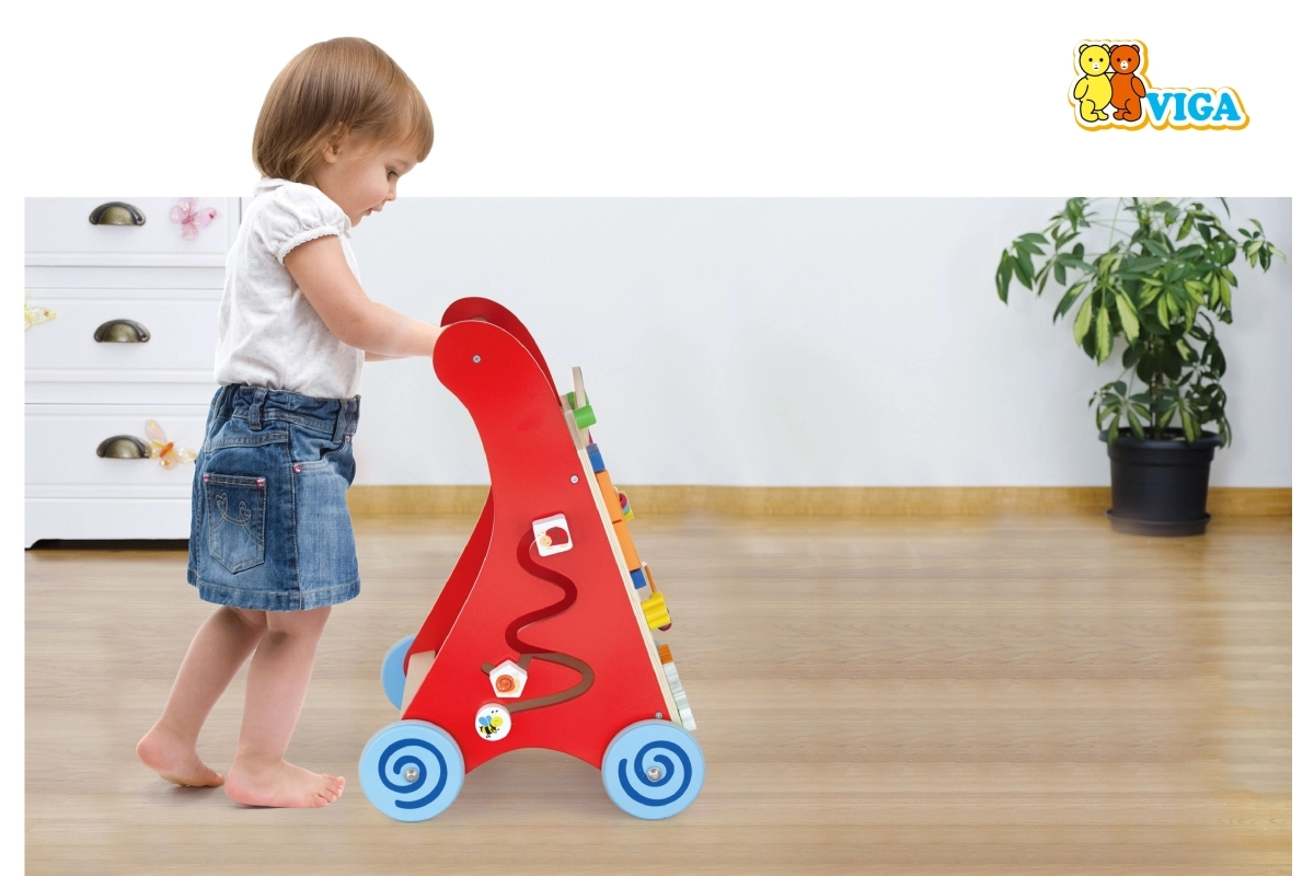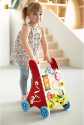 Široko postavljeni kotači s gumiranom površinom štite pod i povećavaju stabilnost, drvena ručka prilagođena je dječjoj ruci. Proizvod je od lakiranog drva, lakovi i boje ispunjavaju norme EN71 i ASTM. Idealno kućno pomagalo za razvoj motorike, strpljenja i mašte.