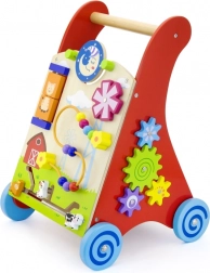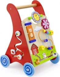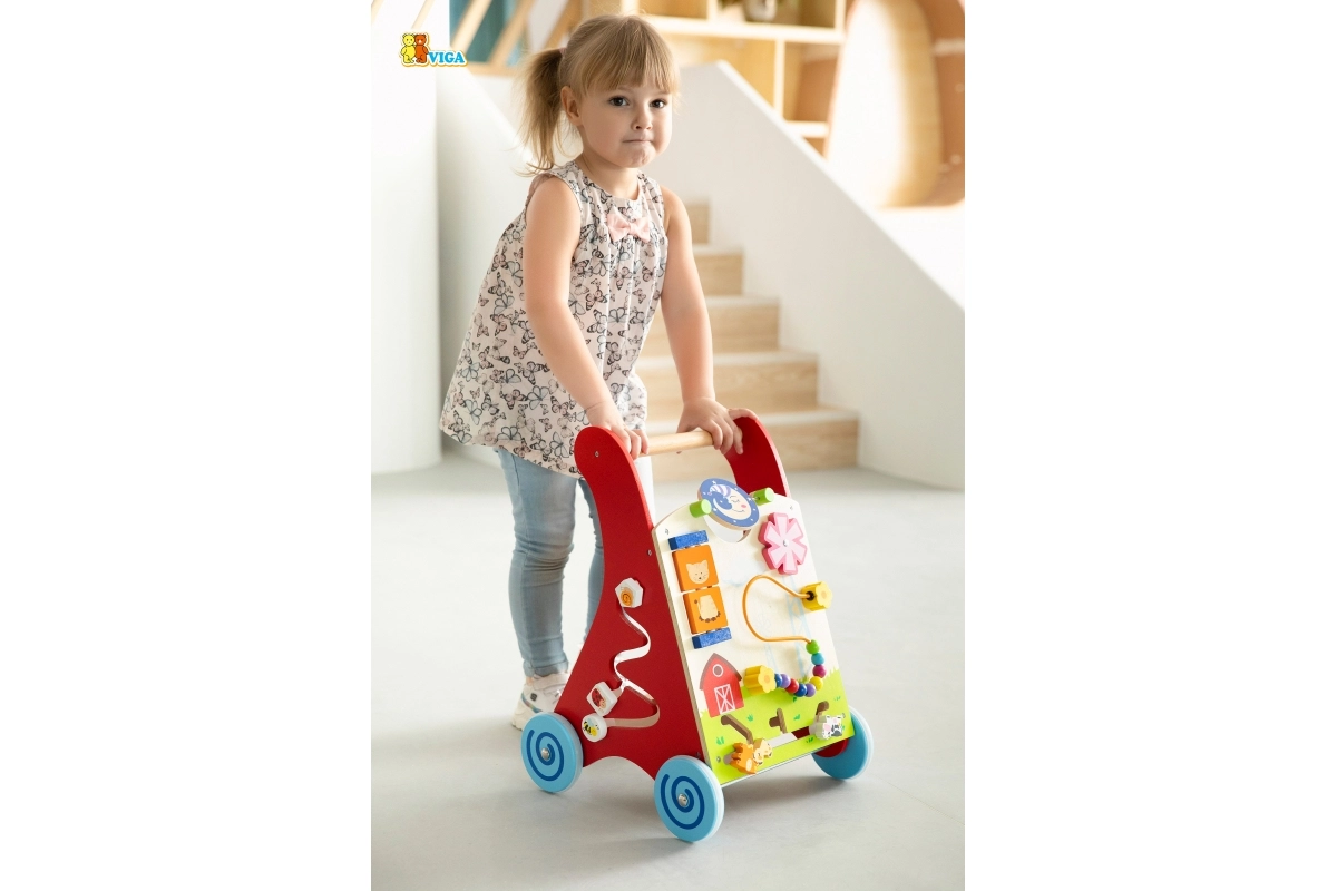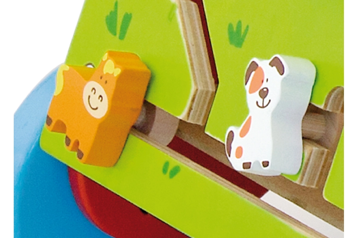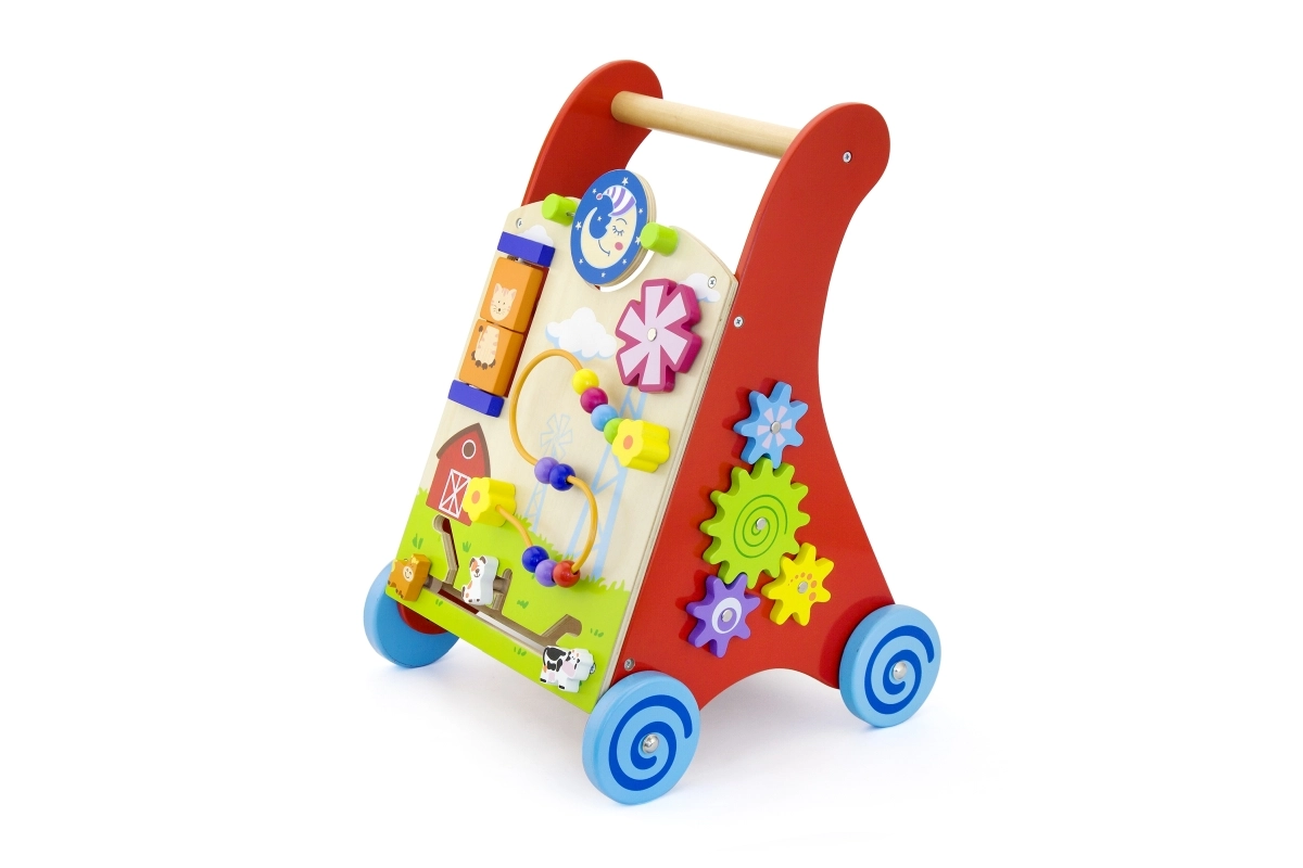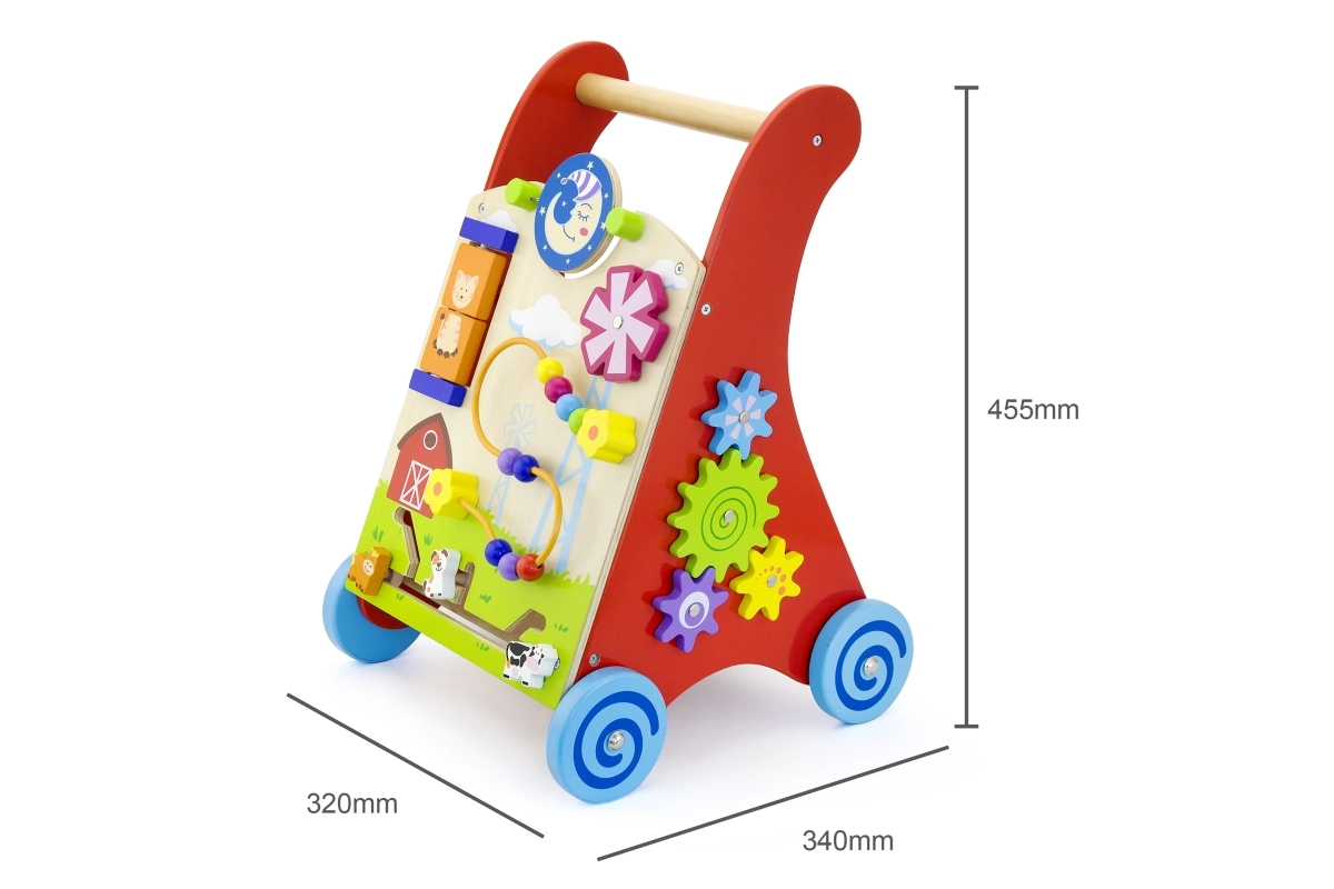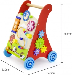 Ova kvalitetna drvena guralica s centrom aktivnosti spaja potporu pri hodu i bogate senzorne poticaje. Prednja ploča nudi rotirajuće elemente sa suncem i mjesecom, okretni vjetrenjač, motoriku s pet perlica, okretni disk s mačkicom te pomične životinjice (kravica, psić, konjić) koje klize po stazi do staje. Bočne strane nadopunjuju zupčanici i staza s pčelicom, bubamarom i pužem.