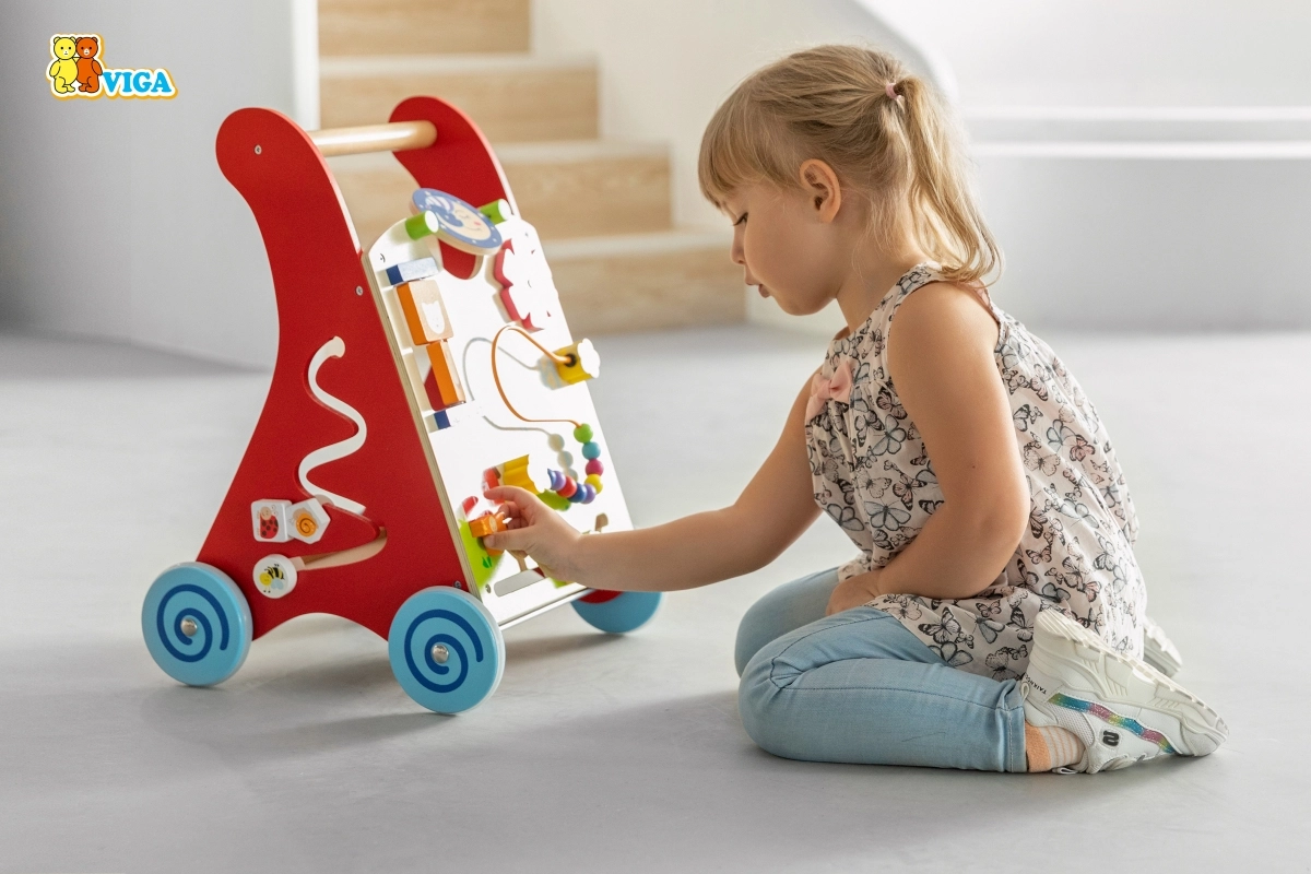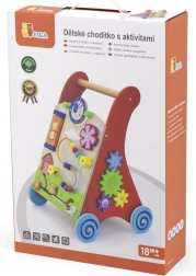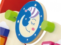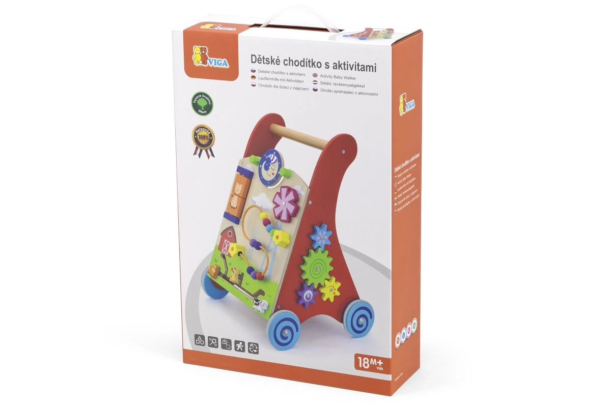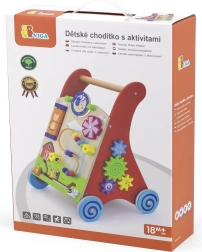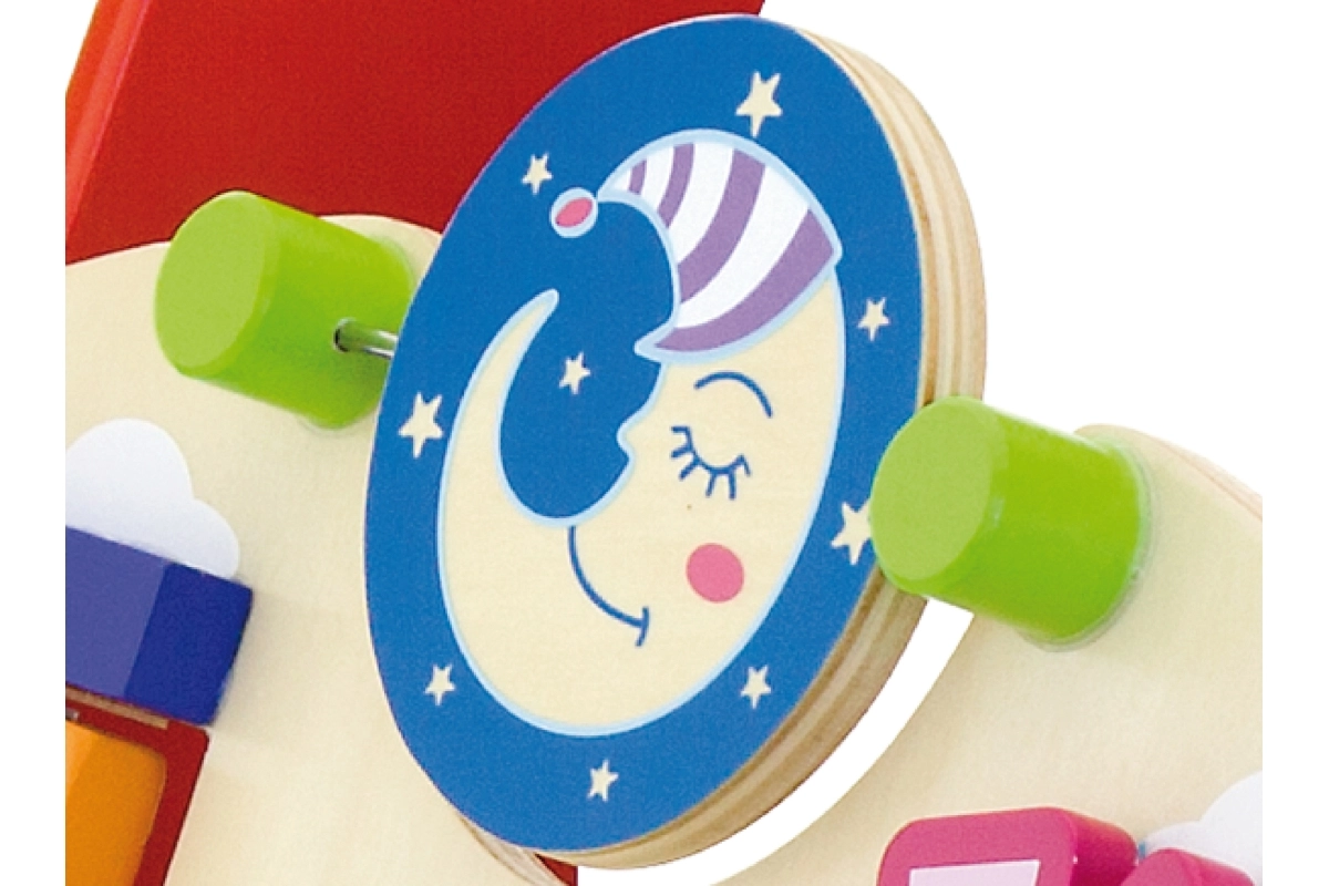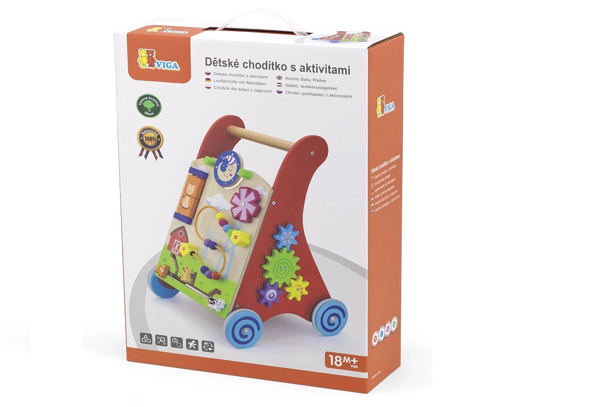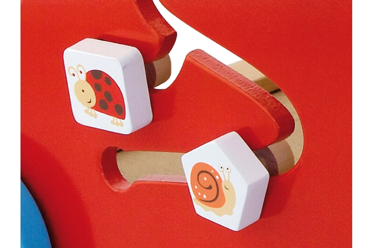 Ova kvalitetna drvena guralica s centrom aktivnosti spaja potporu pri hodu i bogate senzorne poticaje. Prednja ploča nudi rotirajuće elemente sa suncem i mjesecom, okretni vjetrenjač, motoriku s pet perlica, okretni disk s mačkicom te pomične životinjice (kravica, psić, konjić) koje klize po stazi do staje. Bočne strane nadopunjuju zupčanici i staza s pčelicom, bubamarom i pužem.