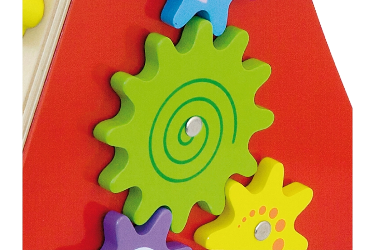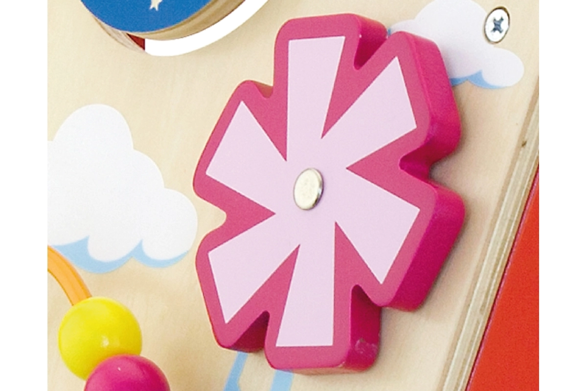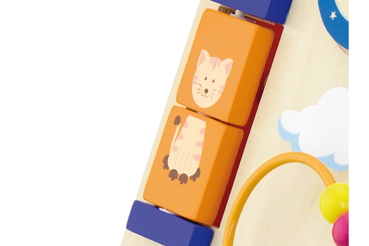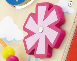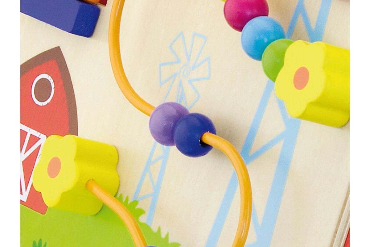 Rotirajući elementi, pomični životinjice, žičana motorika s perlicama i vjetrenjača potiču finu motoriku, strpljenje i razumijevanje uzroka i posljedica.
