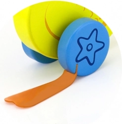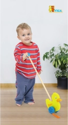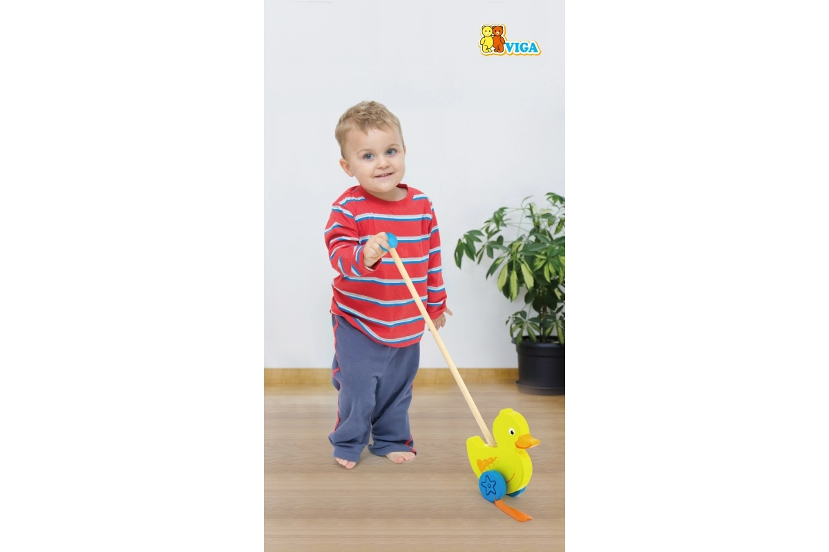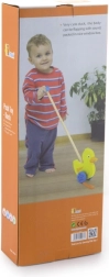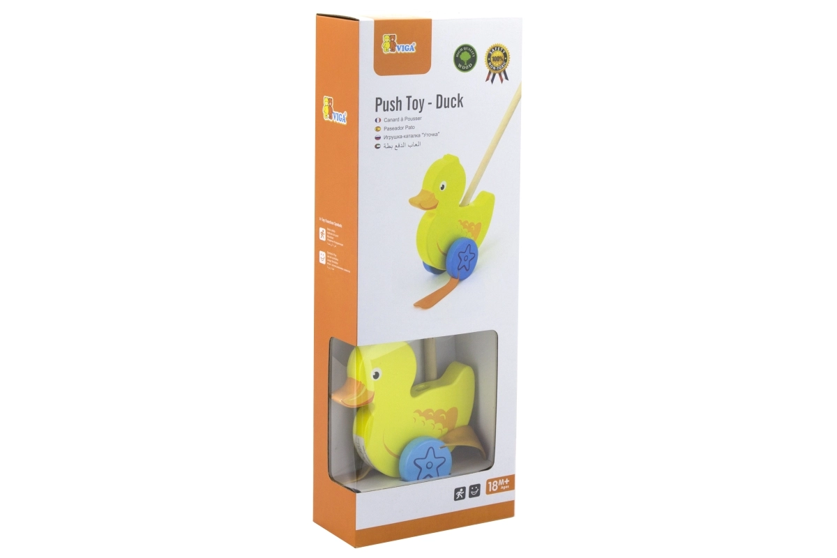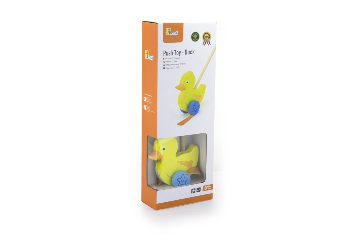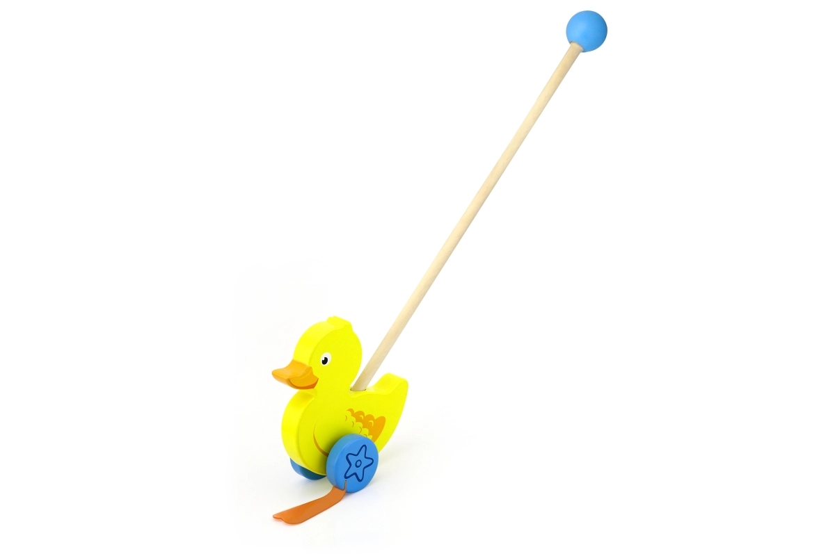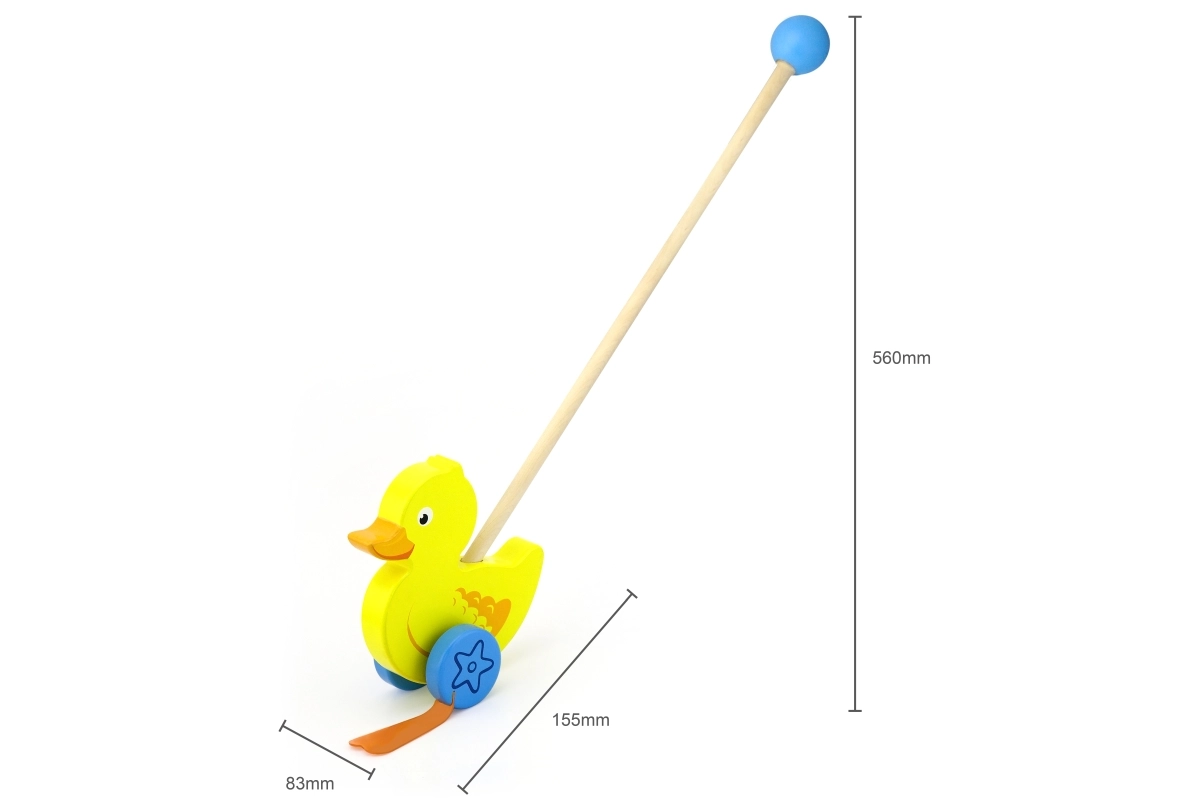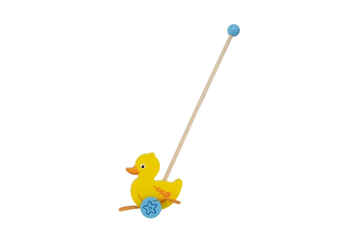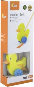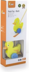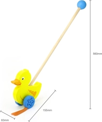 Drveni gurajući pačić na štapu jednostavna je, ali učinkovita igračka koju će svako dijete zavoljeti. To je klasična igračka koja donosi brojne prednosti. Slatki žuti pačić pri kretanju energično miče nožicama, što motivira djecu na šetnju. Igračka je pakirana u estetsku kutiju s prozorčićem koji omogućuje vidjeti pačića. Unutra se nalazi štap s drškom koja savršeno pristaje u malu dječju ruku. Štap nije trajno pričvršćen, što olakšava skladištenje. Cijela je igračka izrađena od bukova drva i obojana netoksičnim bojama u živim nijansama koje privlače pažnju i potiču na igru, donoseći puno radosti.