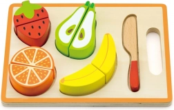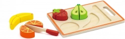 Set sadrži dasku, drveni nož i raznoliko šareno voće koje savršeno pristaje dječjim rukama. Robusna drvena izrada i glatki rubovi jamče dugotrajnost i sigurno igranje.