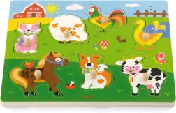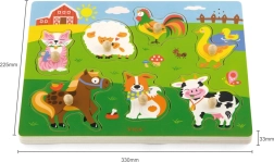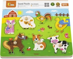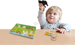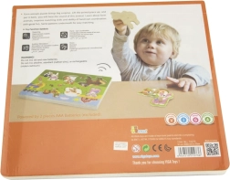 Drvena zvučna slagalica sa životinjama. Nakon umetanja ispravne životinje oglašava se zvuk koji ta životinja proizvodi. Dimenzije ploče cca 30 x 22,5 x 2 cm. Napajanje 2 x AAA baterije (nisu uključene). Dimenzije pakiranja cca 30 x 27 x 2 cm. Dob 18m+