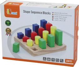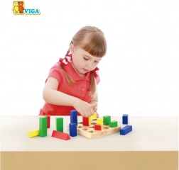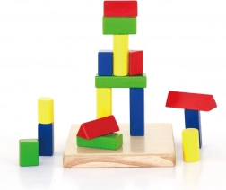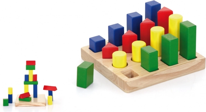 - drvena baza s kočićima i set šarenih geometrijskih dijelova