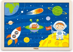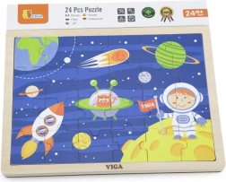 Drvene puzzle VIGA sa svemirskom temom donose djeci od najranije dobi radost otkrivanja. Šarene ilustracije s raketom, astronautom i planetima prirodno potiču prepoznavanje oblika i boja te razvoj oko–ruka koordinacije. Složena slagalica dimenzija je oko 27,5 × 20 cm, pa se odlično uklapa na stol i u dječji kutak.