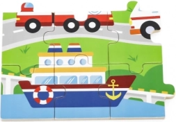 Ova drvena slagalica s prikazima prijevoznih sredstava izvrstan je izbor za prve “veće” puzzle. Zahvaljujući 24 dijela, slaganje je taman izazovno – potiče koncentraciju i donosi zadovoljstvo dovršenom slikom dimenzija cca 27,5 × 20 cm. Šarene ilustracije vozila (sanitetsko vozilo, vatrogasno vozilo, policijski auto, brod, zrakoplov i dr.) prirodno motiviraju djecu na ponovno igranje.