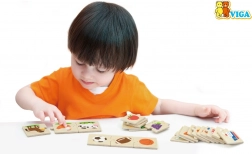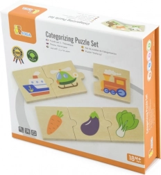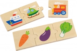 Drvene logičke puzzle VIGA spajaju zabavu i učenje. Djeca povezuju 24 dijela u 8 smislenih trojki – primjerice tri životinje, tri prijevozna sredstva ili tri vrste povrća. Time prirodno vježbaju prepoznavanje kategorija, koncentraciju i rječnik.