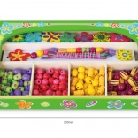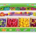 Ovaj drveni set perlica donosi djeci sate zabave pri izradi originalnih ogrlica i narukvica. U kutiji ćete pronaći šarene perlice različitih oblika i veličina, uključujući cvjetne ukrase, te uzice za lako nizanje. Zahvaljujući preglednim pregradama odabir perlica je jednostavan, a stvaranje prirodno potiče koncentraciju i kreativno izražavanje.